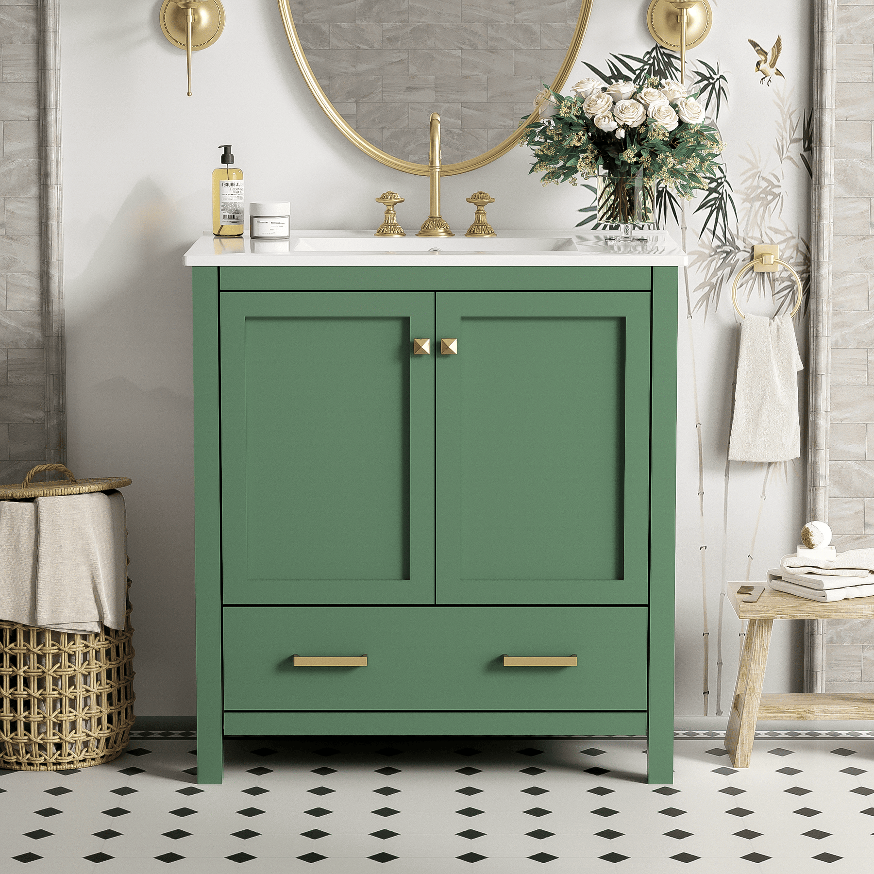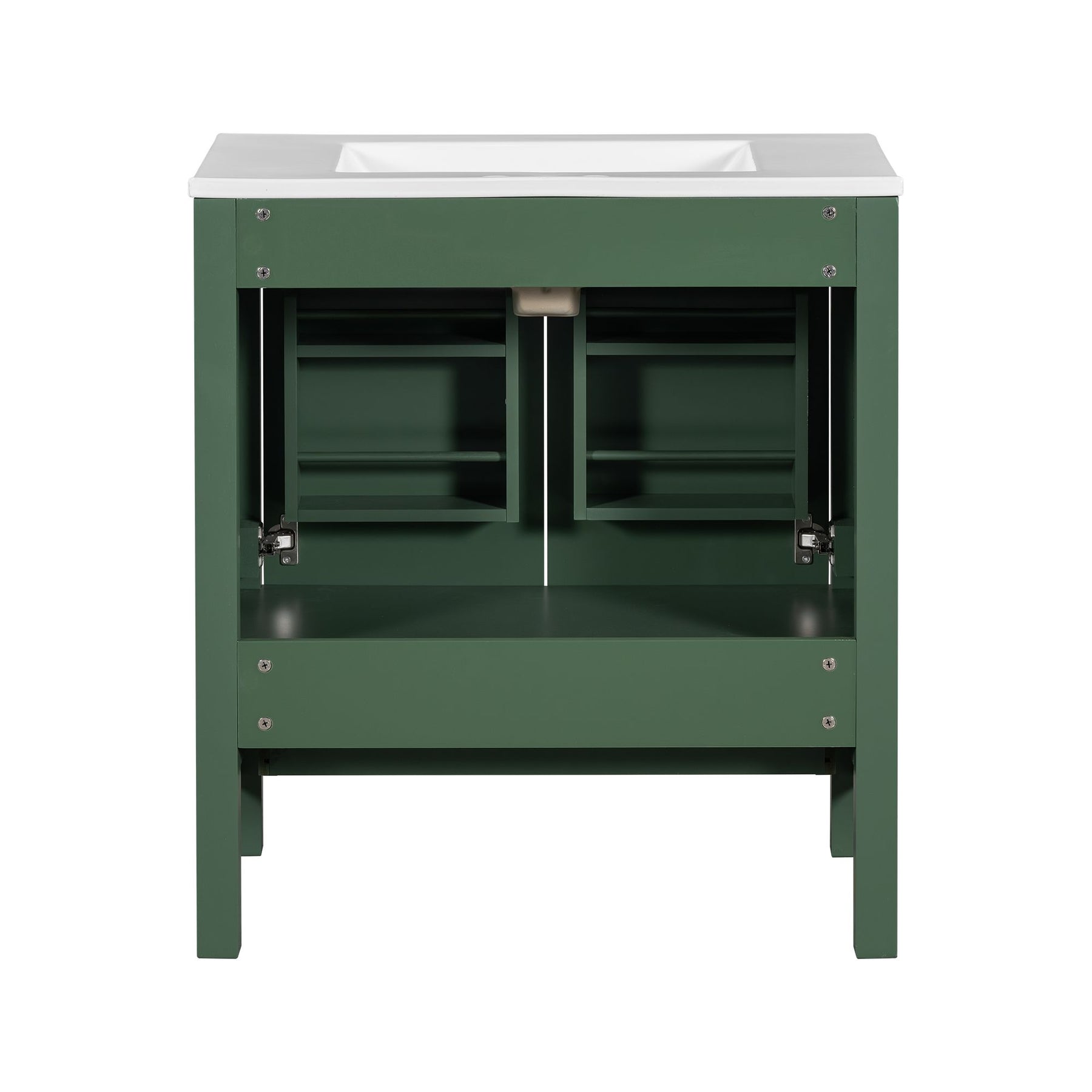 Elegant, durable, and functional – keep your bathroom organized with built-in door shelves, partitioned drawer, and soft-close doors. The white ceramic sink and sleek green finish add style, while solid wood construction ensures long-lasting durability. Perfect for modern bathrooms.