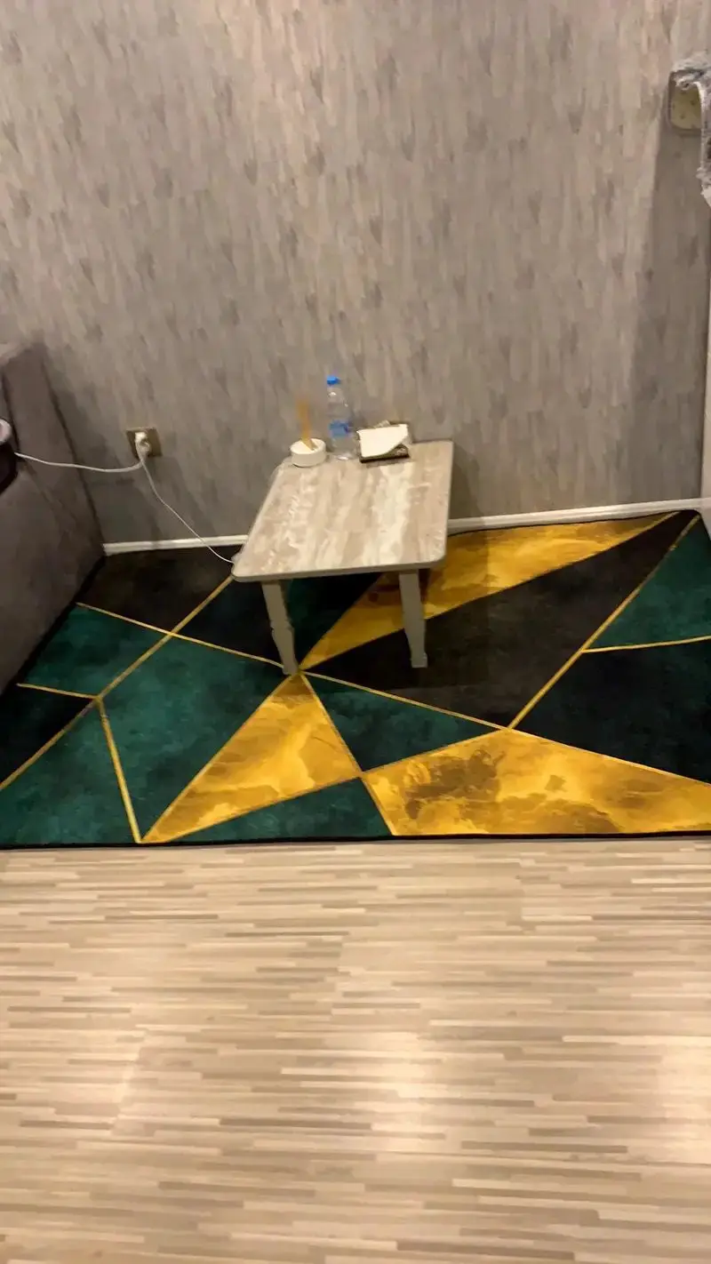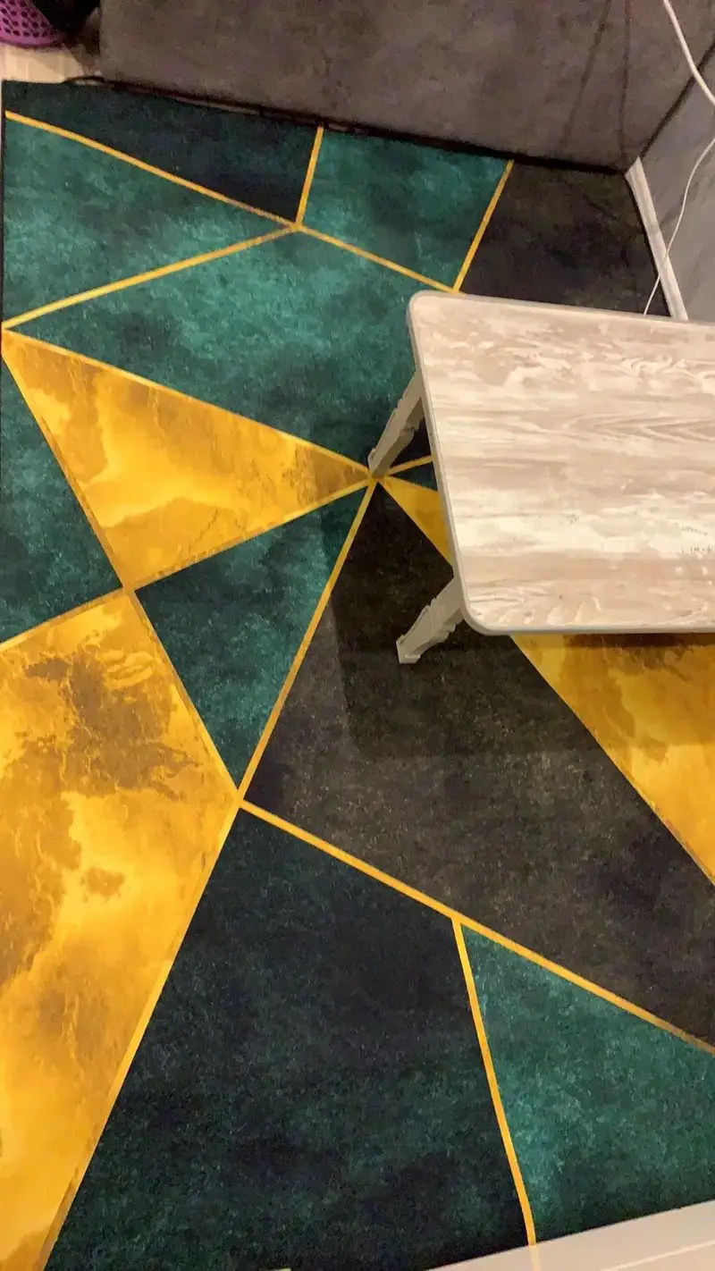 Bring contemporary style and practicality to your home with this geometric area rug. Made from high-quality polyester, it resists stains and dirt while remaining soft underfoot. The striking black, green, and gold pattern adds a vibrant touch to any space. Perfect for living rooms, bedrooms, dining areas, or dressing rooms, this rug combines elegance and functionality with easy maintenance.